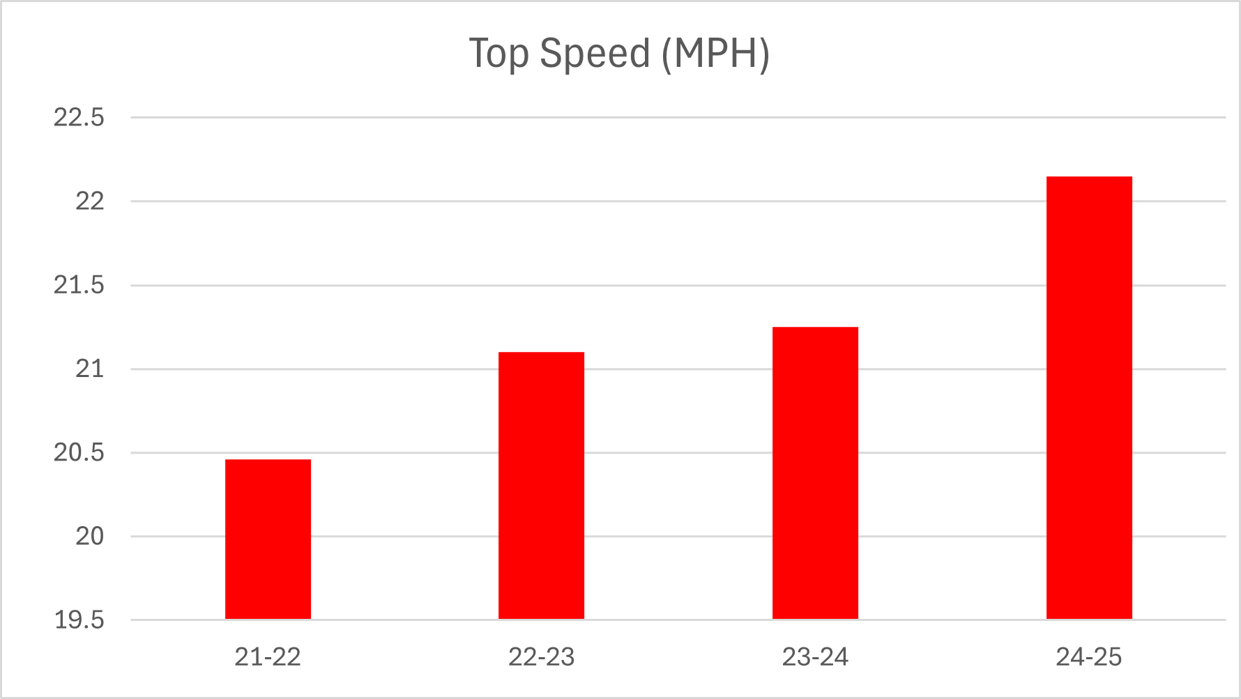 Where he does clock in below league average is that 20-22 MPH bursts, which I think shows a lack of acceleration to that top speed and why he gets visibly burned occasionally. He has been pretty consistent year-over-year, though, and shows no real decline in footpseed by any measure: