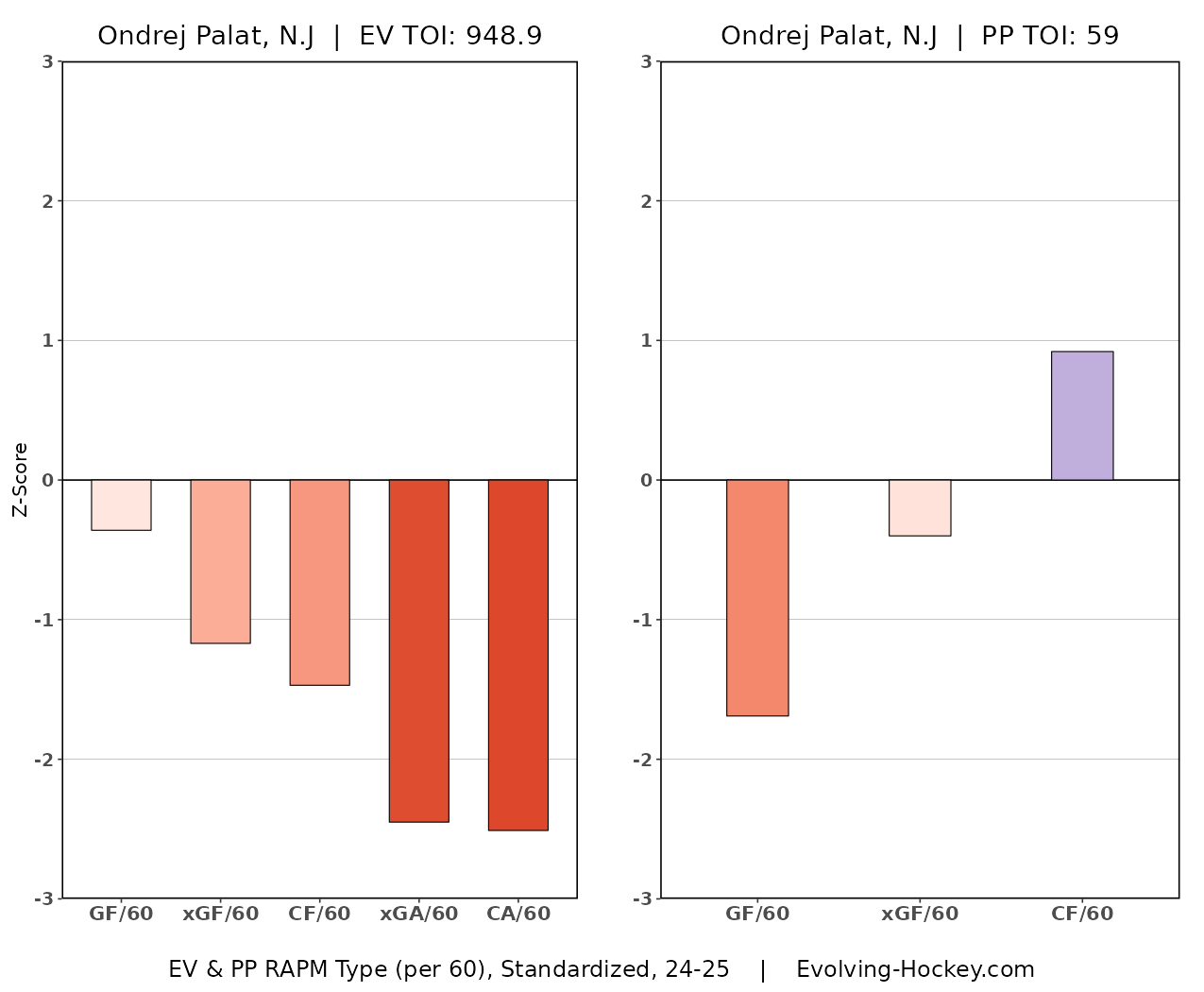 Palat’s impacts look similar on Evolving-Hockey’s RAPM charts. Palat being on the ice leads to a large-scale increase in shots and chances against, indicating some level of dysfunction for Palat within Sheldon Keefe’s system. His impact on goals scored by the Devils is not incredibly negative, but the defensive woes are enough to give any fan pause about the idea of continuing to use Palat in any top six role, while making it seem unlikely that he will bounce back at age 34.