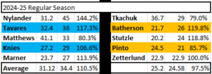 This table below is very interesting, and it shows expected goals, actual goals, and goal-producing efficiency. As you can see the Leafs high-end skill is very strong. They generate more, score more, and do so, more efficiently. That is okay, as Ottawa has a gameplan that can still win. The Sens use speed, skill, and playing the body to force turnovers and being able to finish. Mix in some great goaltending and you have a recipe for success.