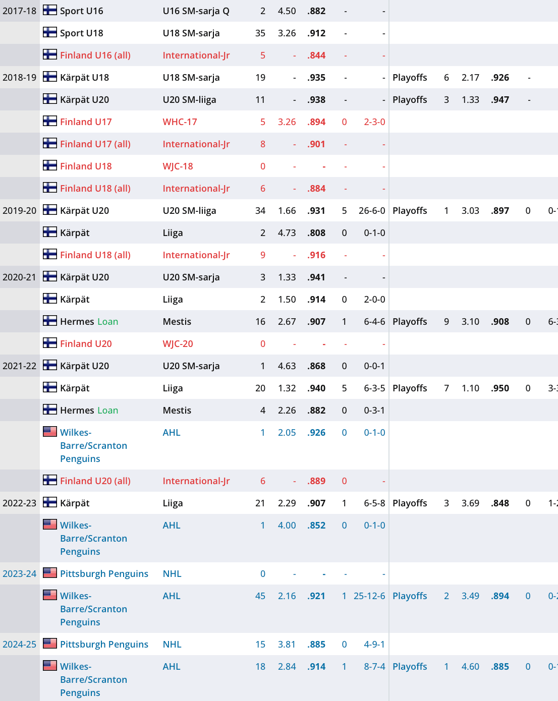 Blomqvist ended the NHL season with a .885 save percentage and 381 GAA in 15 games (12 starts) with the Penguins. While playing for Wilkes-Barre/Scranton whenever Jarry was back in the NHL mix, he registered a .914 SV% and 2.84 GAA in 18 AHL games.