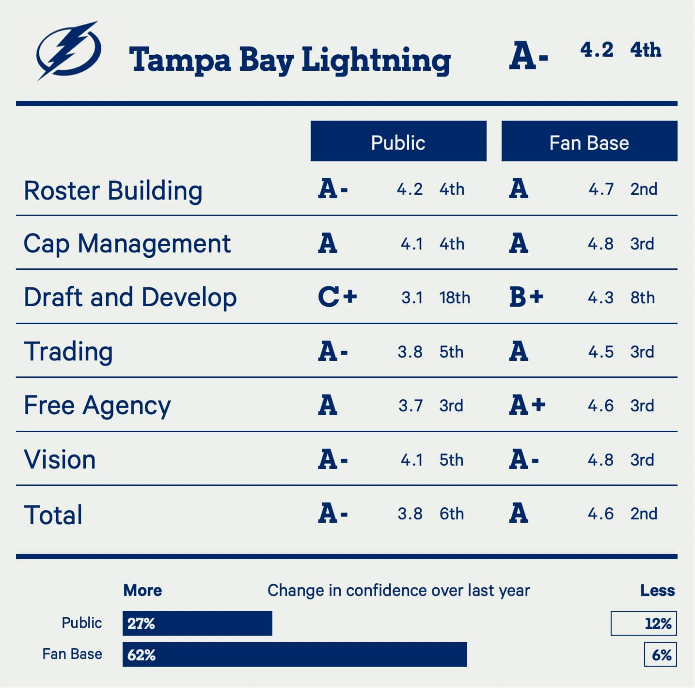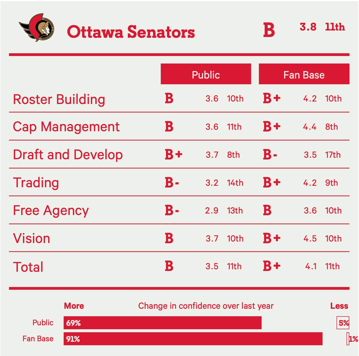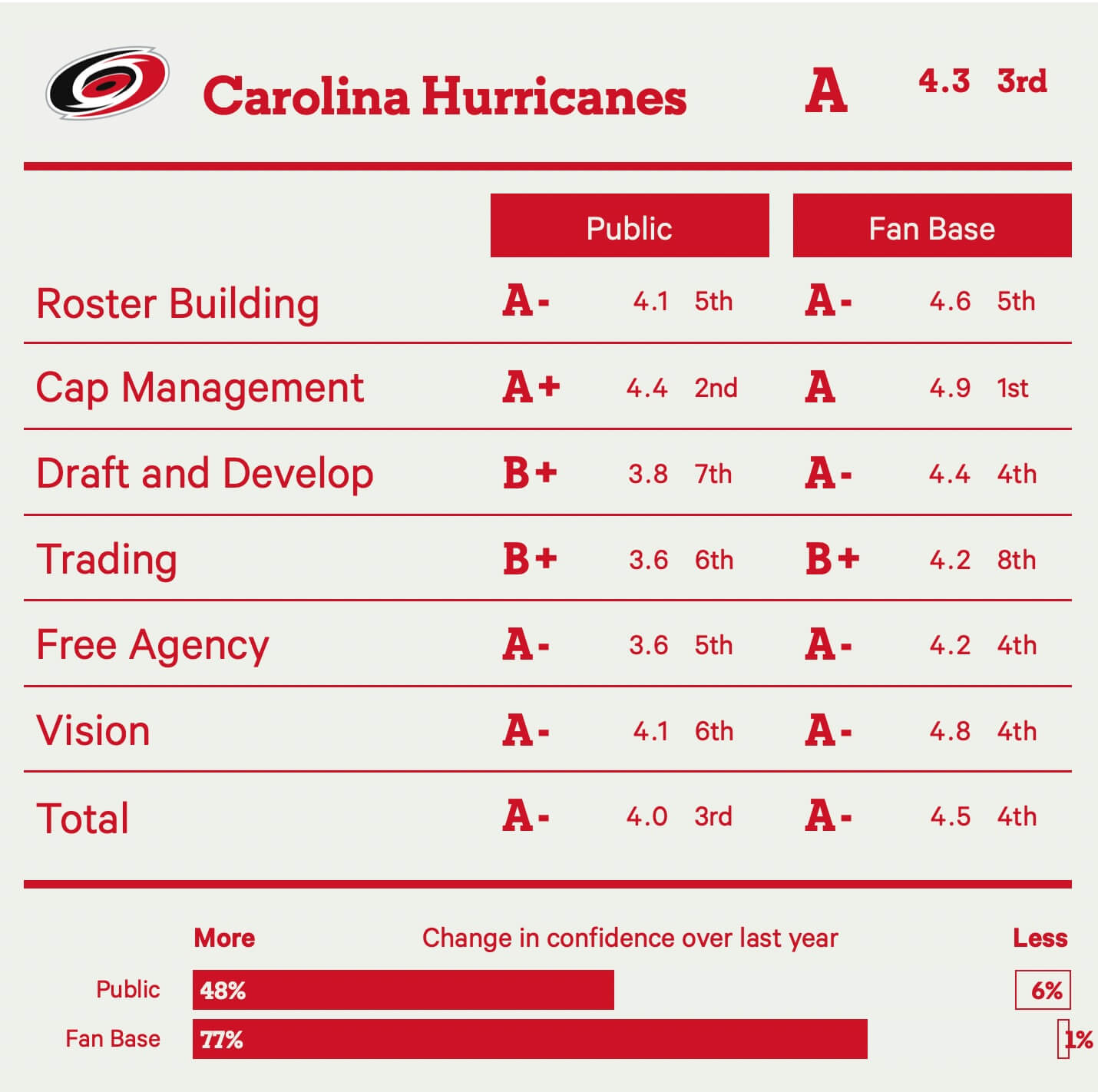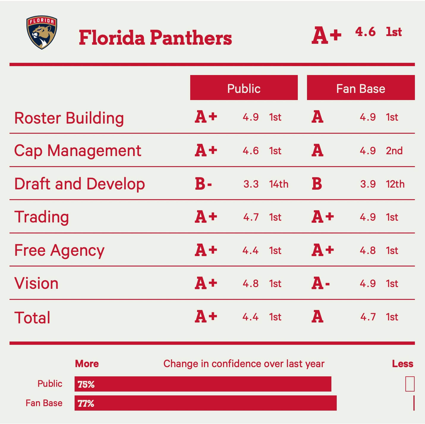 It’s a shame, though, because the Panthers are otherwise as close to front office perfection as you can get. It’s extremely rare for a team to have a 4.9 average in any single category; the Panthers have it in four of six categories from their own fans.