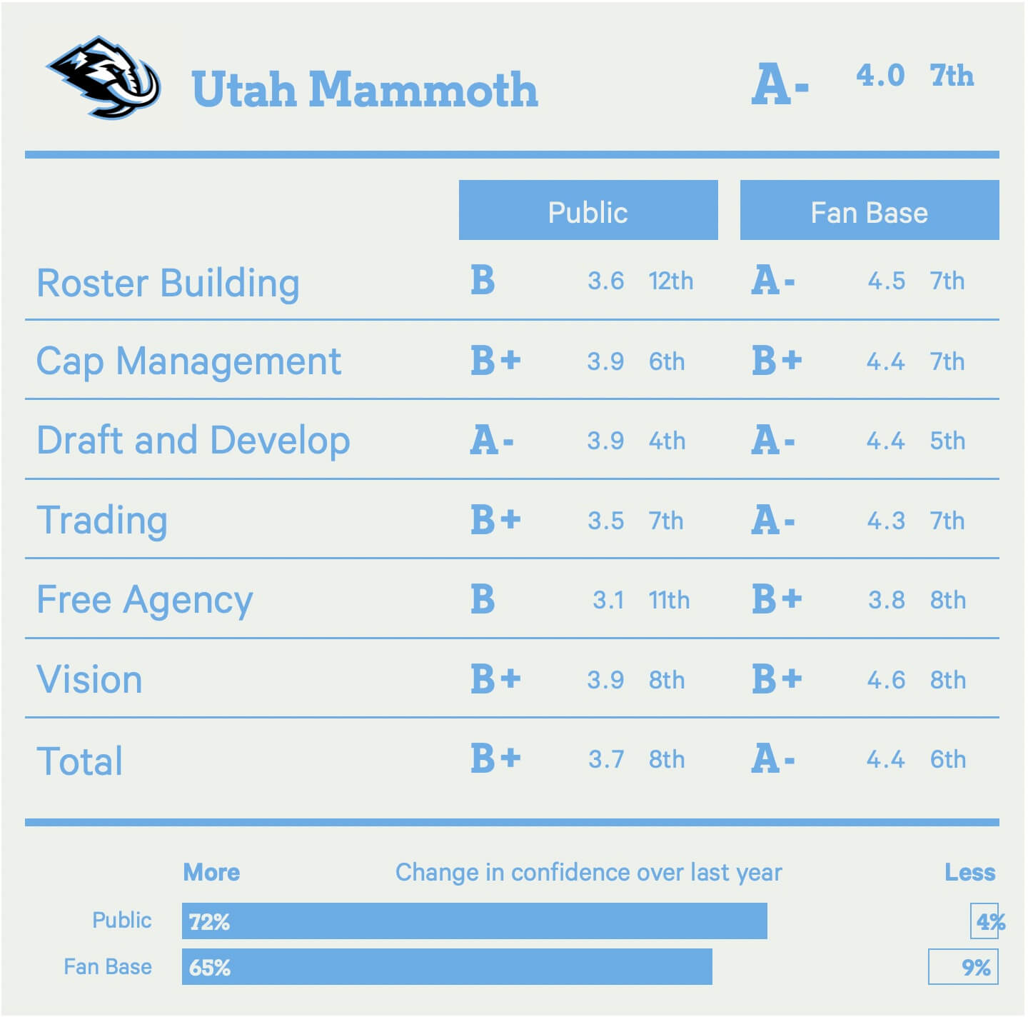 It’s not perfect and can often be driven by recency bias given the sometimes-irrational year-to-year movement. But as a vibe check, it works as a way of showing how each team’s brain trust is perceived at this snapshot in time — both inside and outside the fan base.