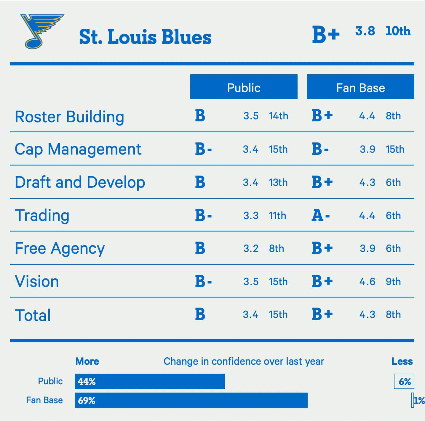 There are still some moves from the past that sting — especially losing Alex Pietrangelo and every subsequent move to fill his shoes. But it’s hard not to be confident in St. Louis’ front office after last season. It made all the right moves and the Blues went back to the playoffs because of it.