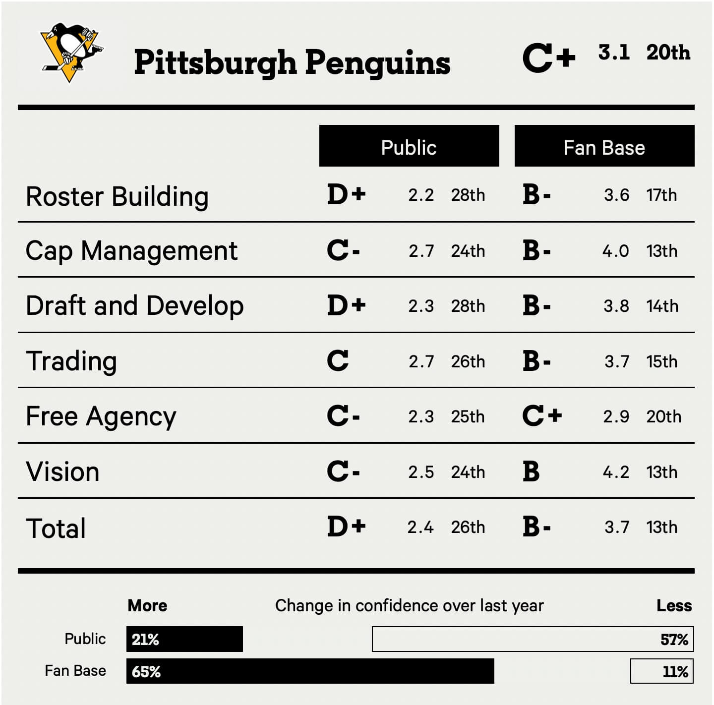 His work since, though, is what’s caught the fan base’s eye. The big thing is the team accepted its fate as a rebuilding club and their work towards that goal has given the fans a sense of hope. The Penguins have leveraged cap space for picks well and they’ve done a good job restocking the prospect pipeline, too. There’s a clearer vision of a post-Crosby future and that’s provided some optimism.