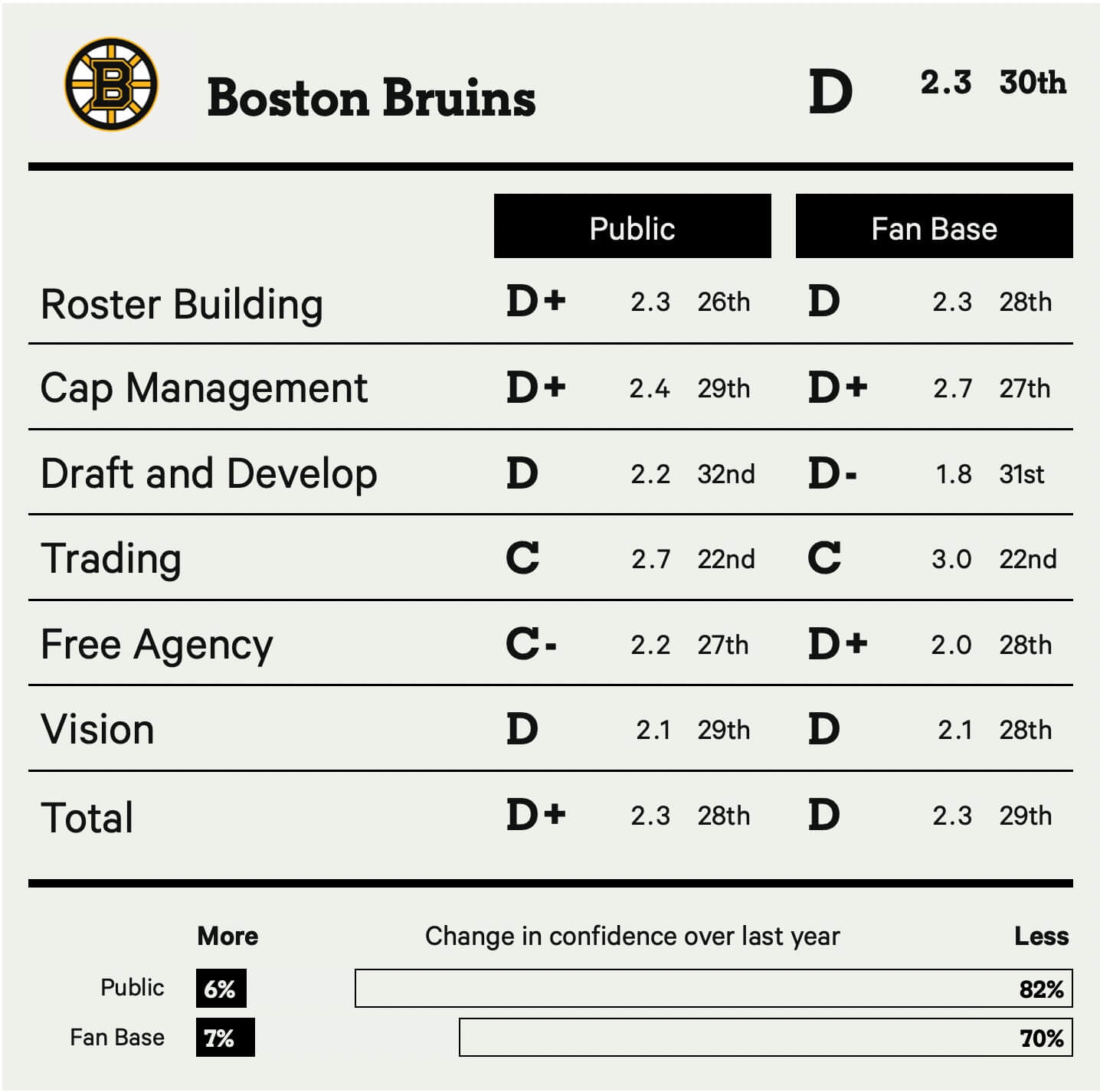 That’s changed this year as public opinion of the Bruins’ front office has sunk just as quickly as the team did on the ice during the 2024-25 season. Now there’s no denying what the fan base has feared even during the successful seasons: the current regime just isn’t up to par. Only two teams, Nashville and Vancouver, lost more confidence in the eyes of the public than Boston.