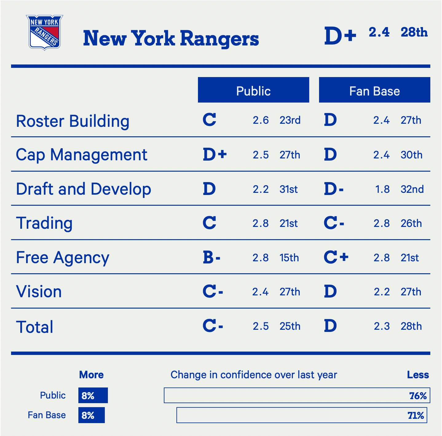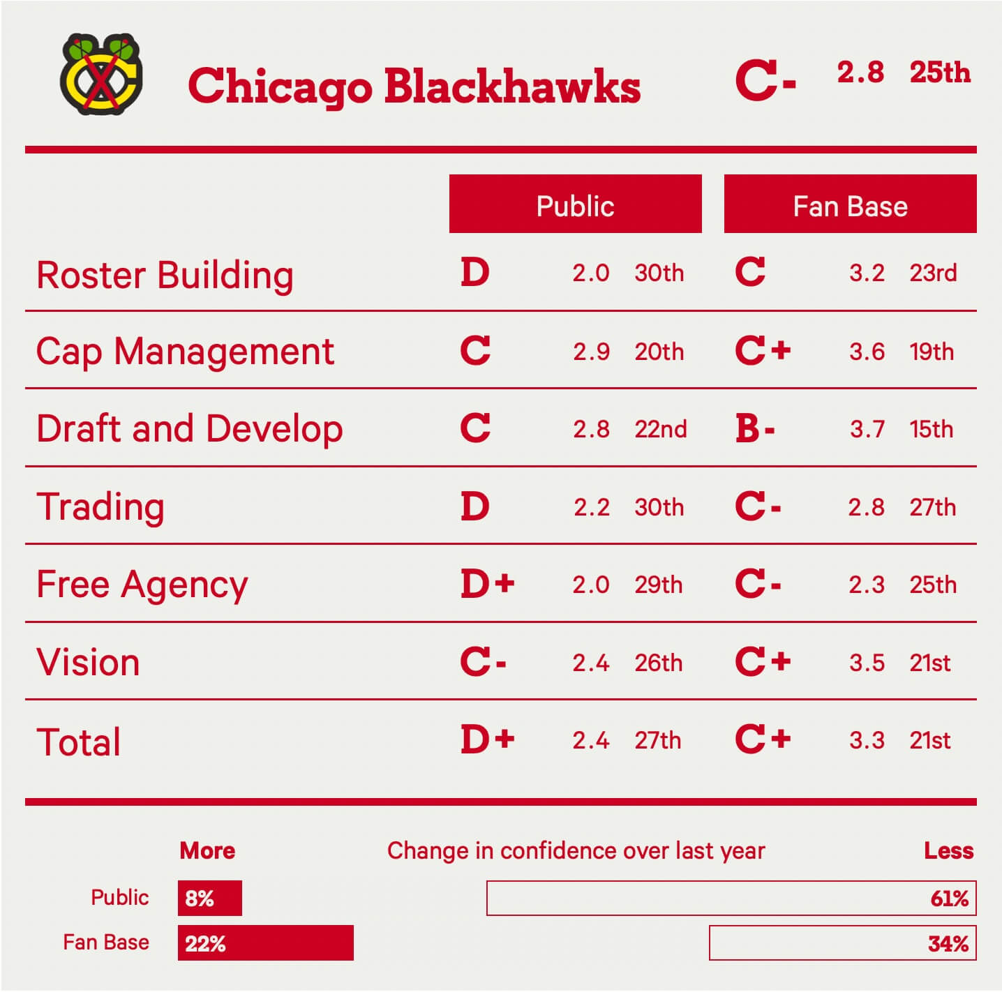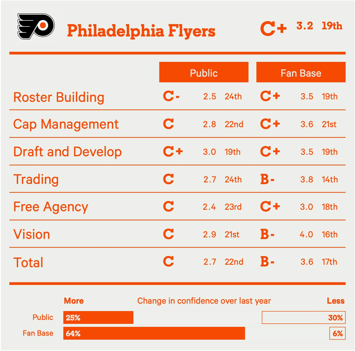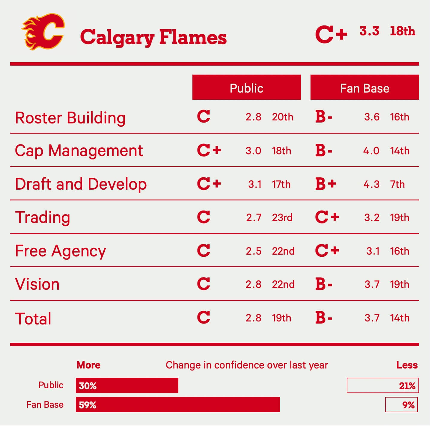 What saves the Kraken is their drafting ability, an area that holds a lot of weight in this survey and one the fan base is still fairly confident with — relatively speaking. Seattle has some exciting young pieces on the roster and some intriguing talent in the pipeline, enough to keep the Kraken away from the bottom three. They’ve also made some decent trades of late for Kaapo Kakko and Mason Marchment. But overall, it’s just not enough to overlook everything else wrong with a front office seemingly devoid of a competitive vision. What exactly is the plan here?
