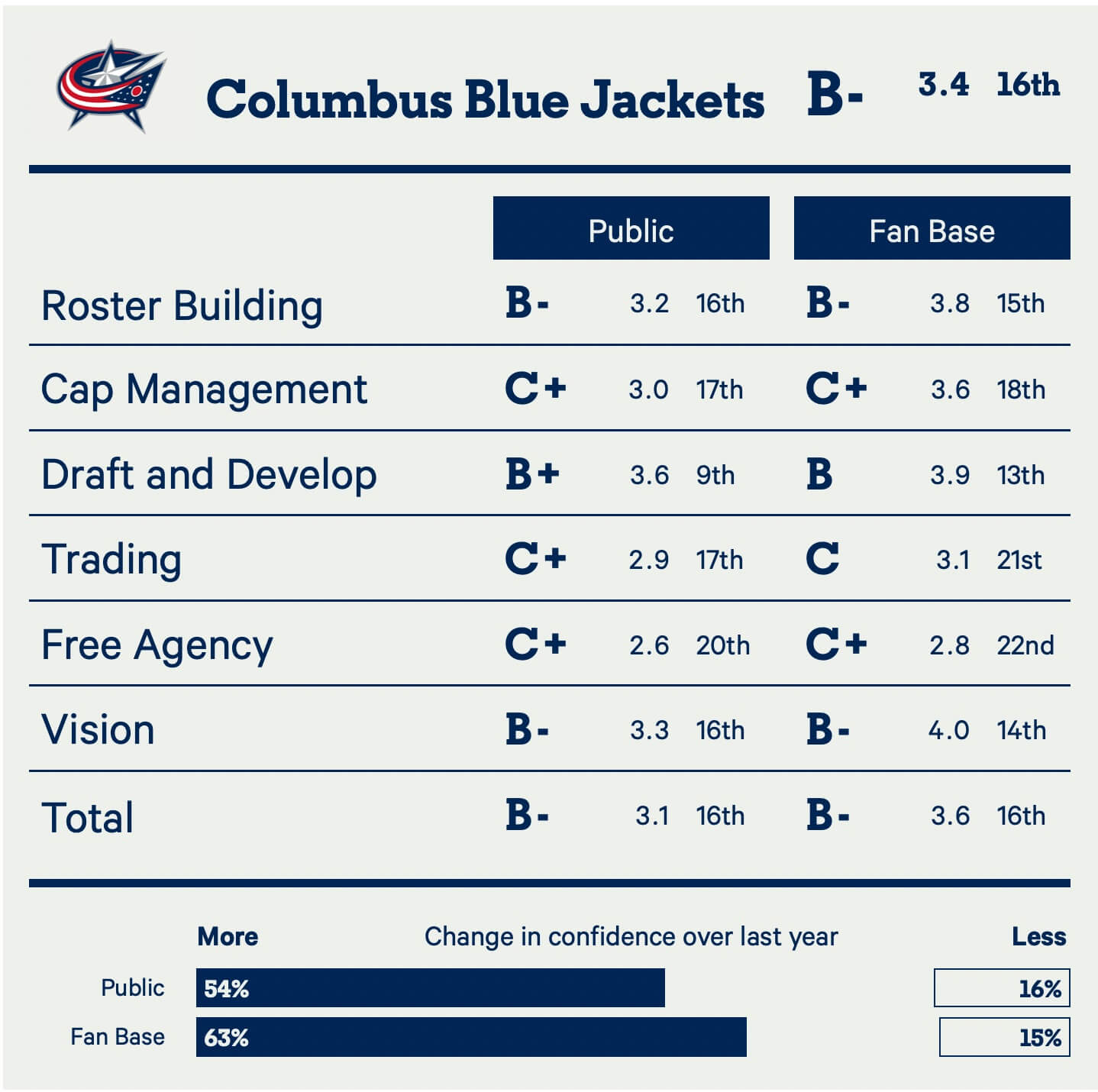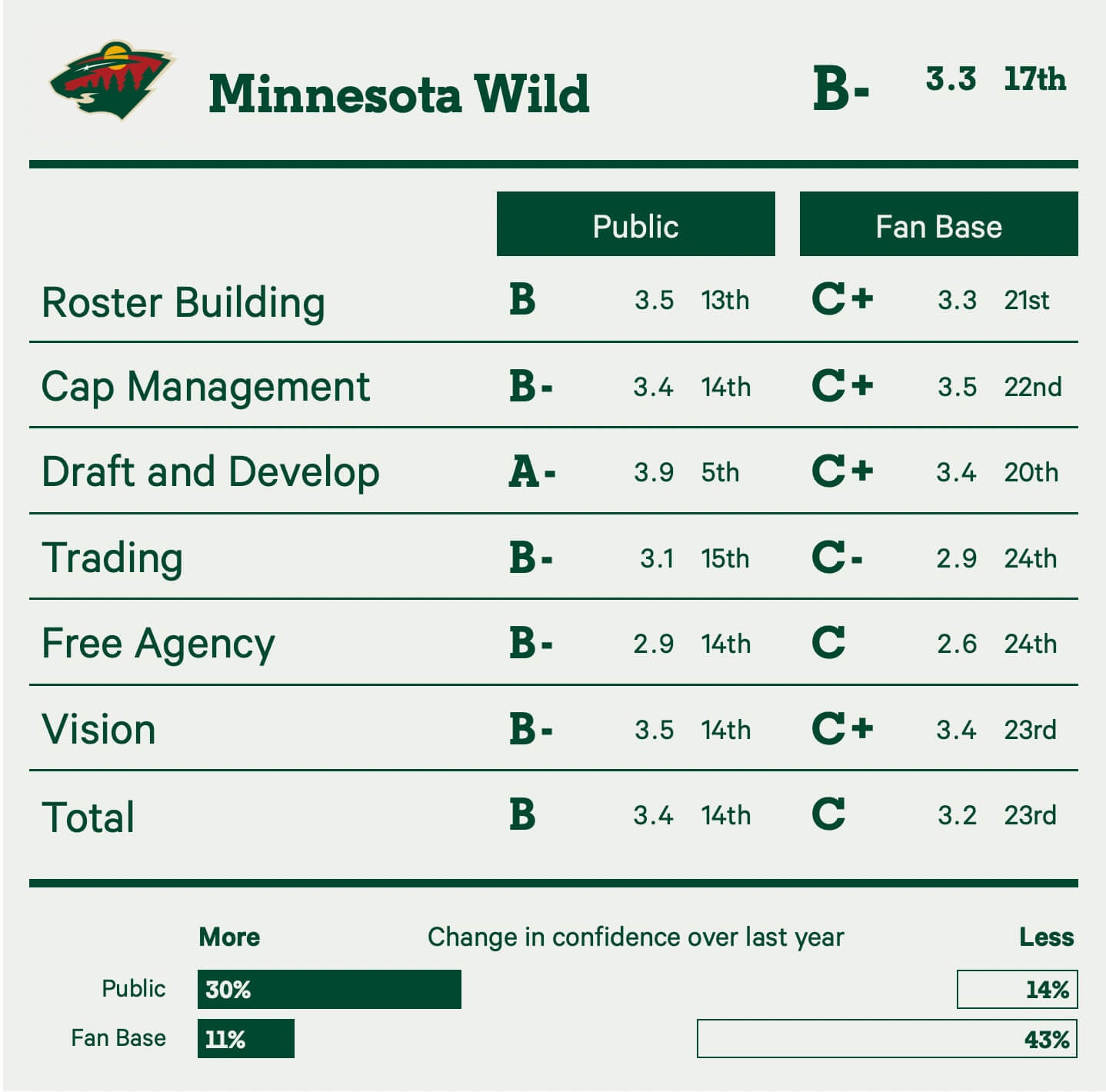 “Their hands are tied when it comes to free agency and trades, but it would’ve been nice to be a bit more aggressive at the trade deadline. Overall, the management team does a great job icing a winning franchise in the NHL’s smallest market and worst arena.”