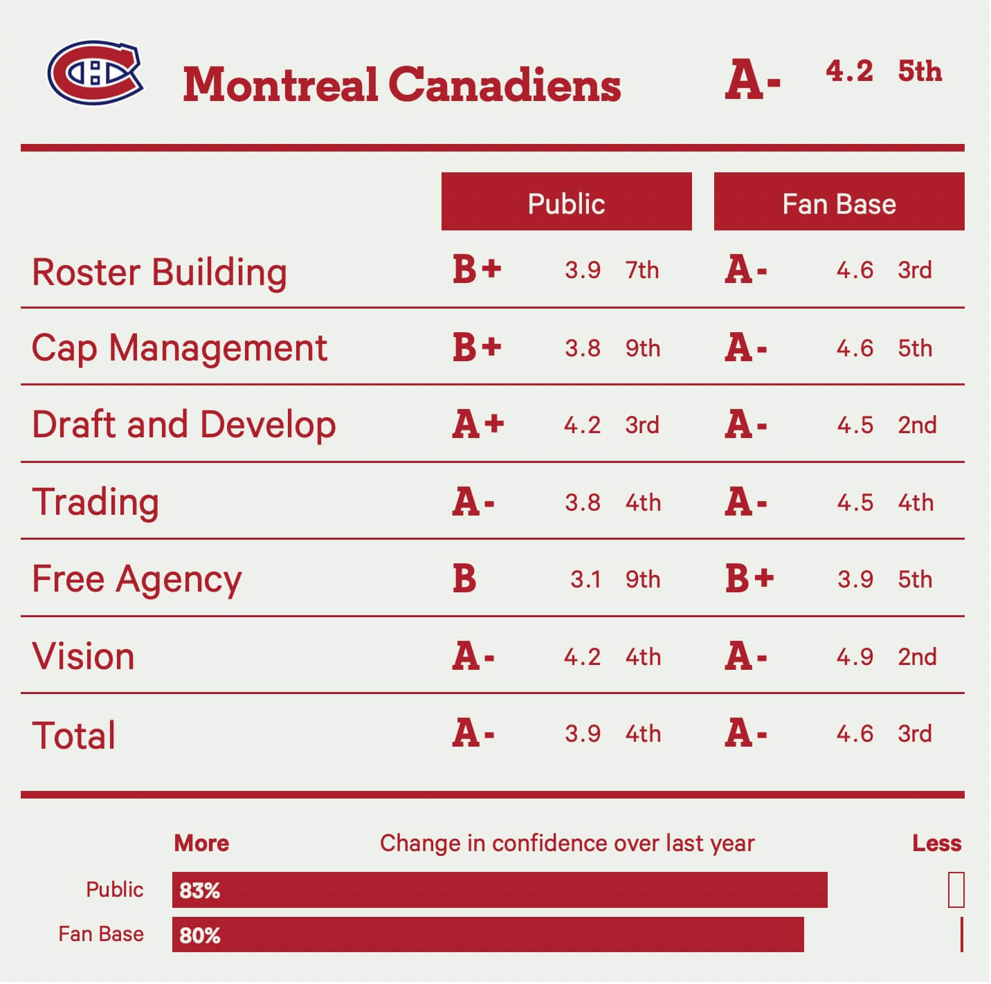 One last thing to note: the sheer passion of the Canadiens fan base as the only team to garner over 1,000 survey responses. And those fans seem unilaterally thrilled with what they’re seeing from the front office.