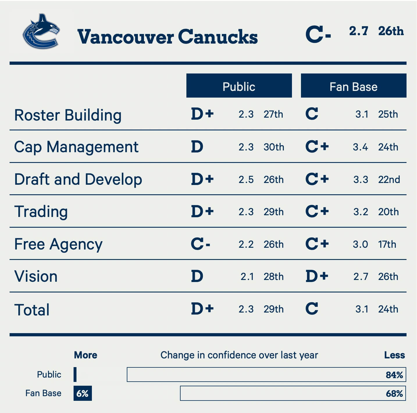After an extremely turbulent season, it’s no shock the Canucks dropped further in these rankings than any other team, going from the top five to just outside the bottom five.