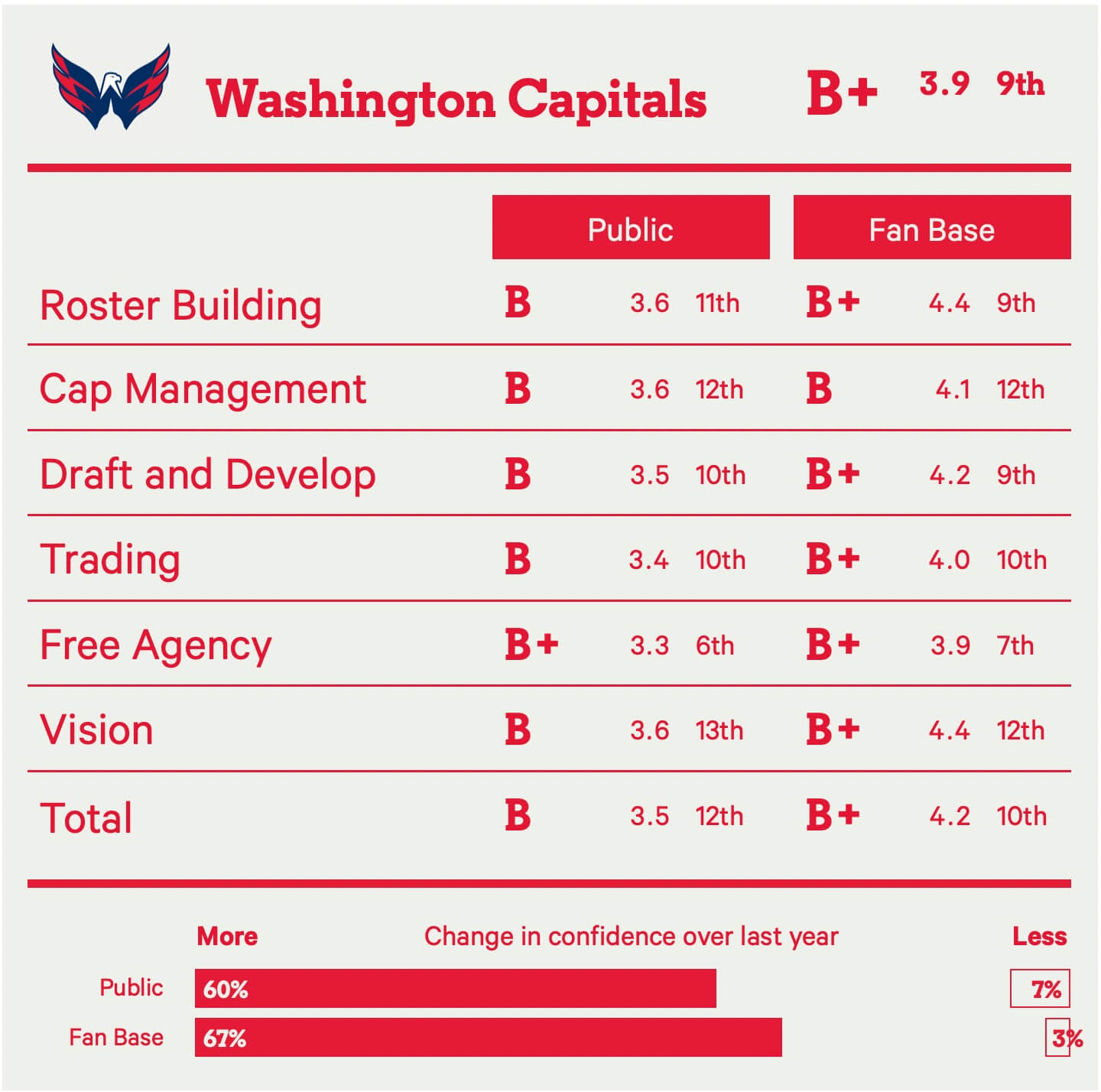 “Last year’s savvy reload turned this team into the best team in the Eastern Conference, and continued strong drafting have given me great confidence in GMCP. Only question I really have is how well the young core will develop as the team shifts to the post-Ovi era.”