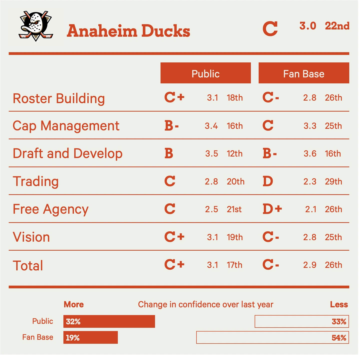 The Ducks are this year’s biggest “wait-and-see” team given their coaching change. With Joel Quenneville behind the bench, it’s possible a lot of budding potential is finally realized this season, leading to a much rosier view of the front office. The team’s definitive future between the pipes, with the big bet on the underrated Lukas Dostal, was also viewed as a plus.