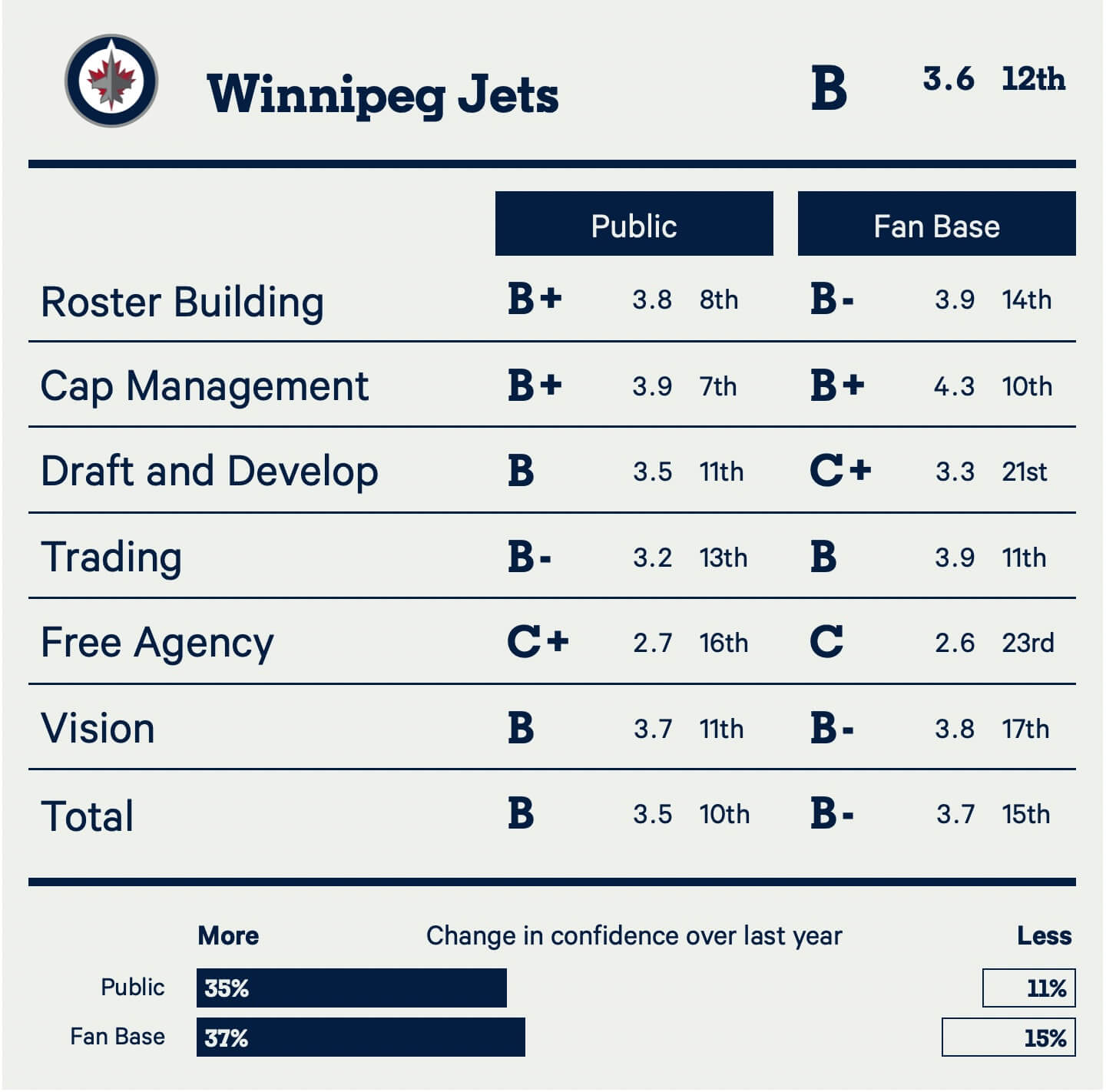 The Jets are a hard front office to judge given the context of their market, but it’s tough to deny the results over the last two seasons. Cheveldayoff and company have done a strong job here.