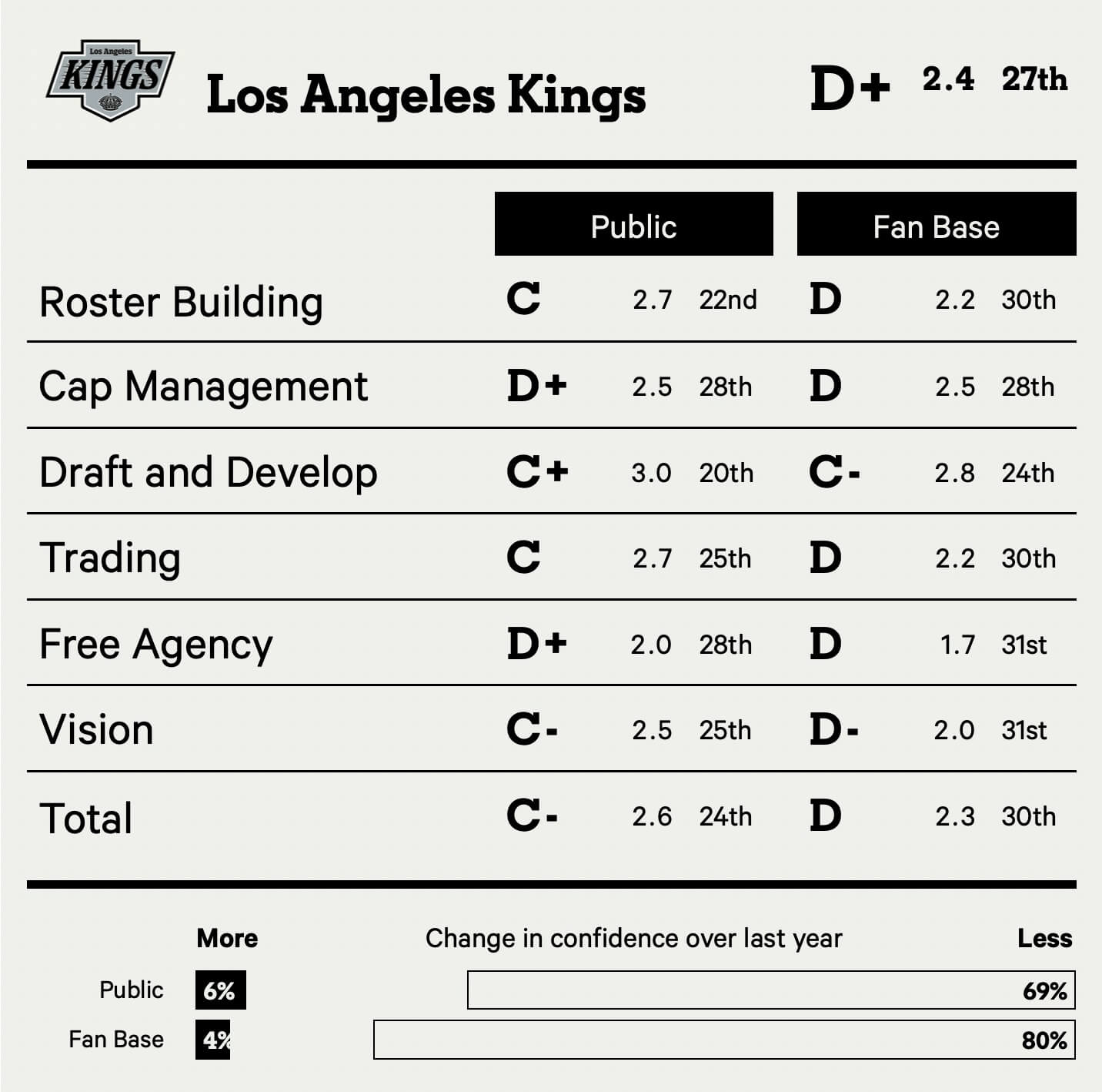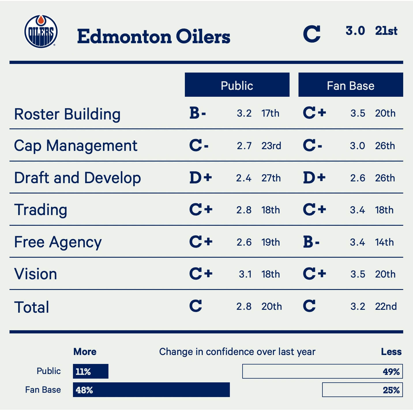 After back-to-back Stanley Cup Final berths, the Oilers have moved from 25th in front office confidence to 21st. Tough crowd.