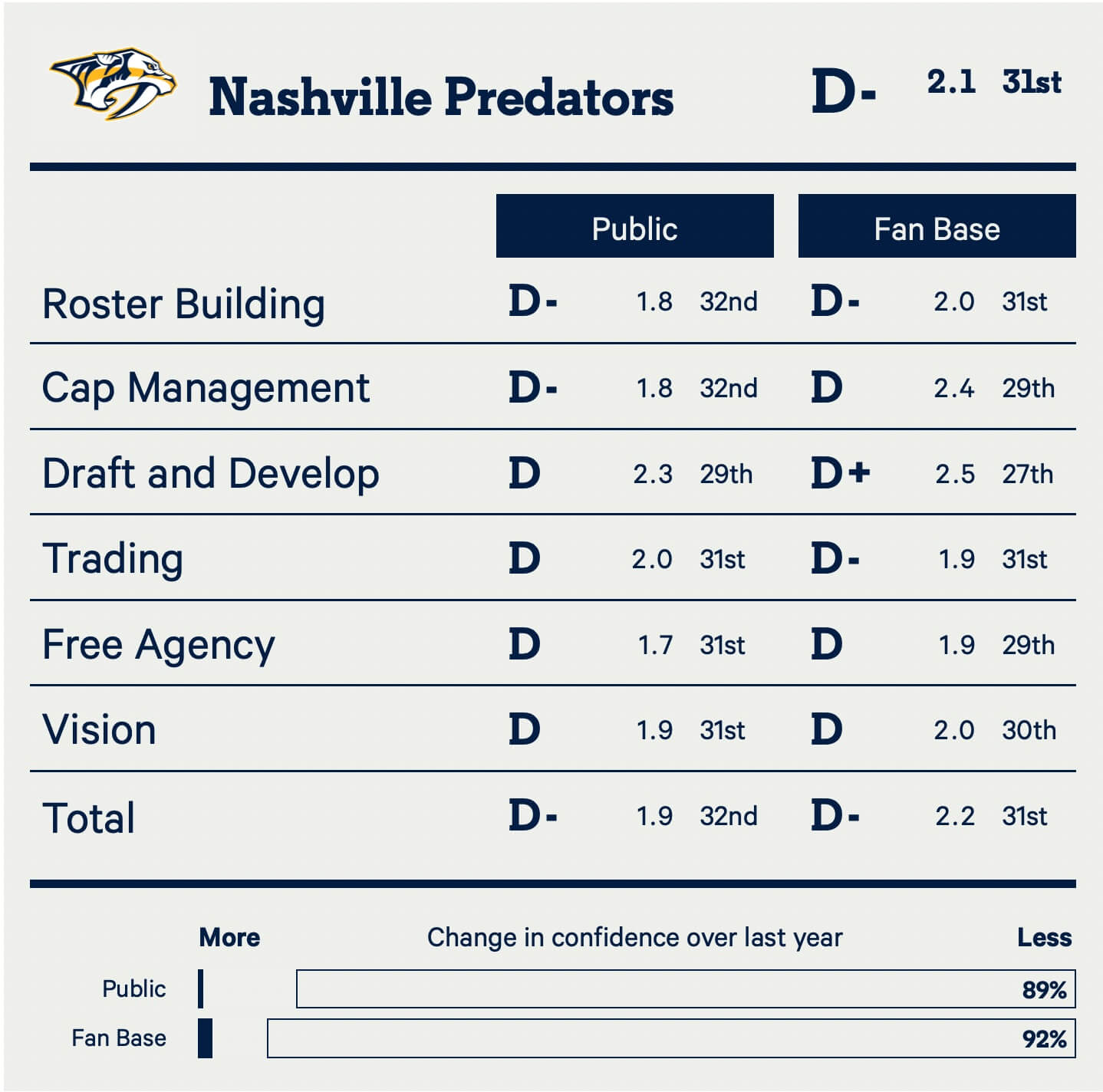 The 2024-25 campaign was a season from hell for the Predators, where everything that could go wrong did. What started incredibly hopeful turned incredibly sour quickly, leaving 92 percent of fans less confident than they were one year ago. No other fan base is above 80 percent.