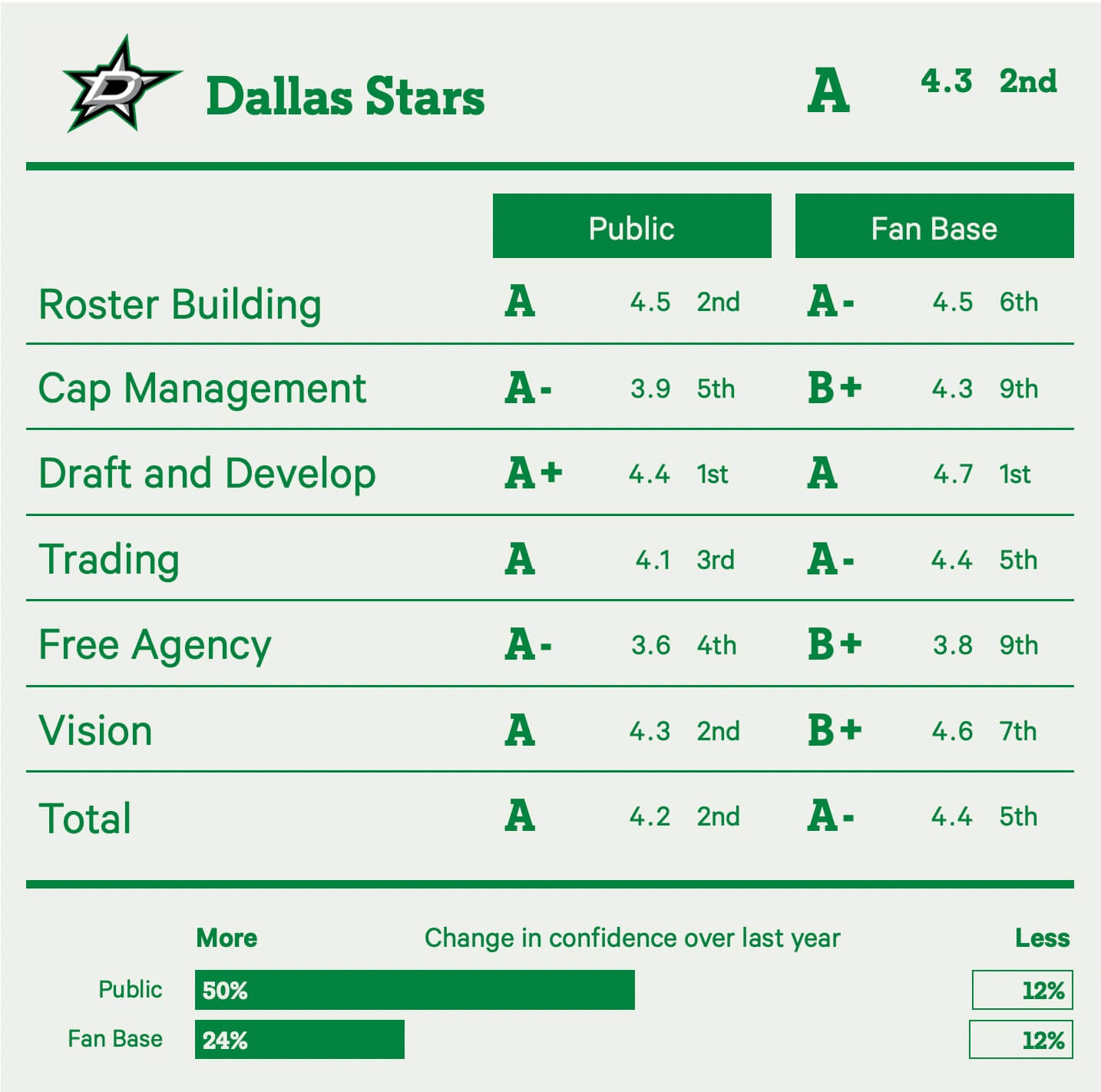 The only current dynasty in the sport belongs to Jim Nill, the back-to-back-to-back winner of the Jim Gregory GM of the Year Award. Clearly, it’s well deserved as both the public and fans hold Dallas’ front office in incredibly high standing, ranking the Stars as the league’s second-best front office for the second straight season.