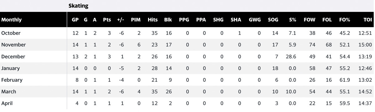 Noel Acciari’s monthly splits.