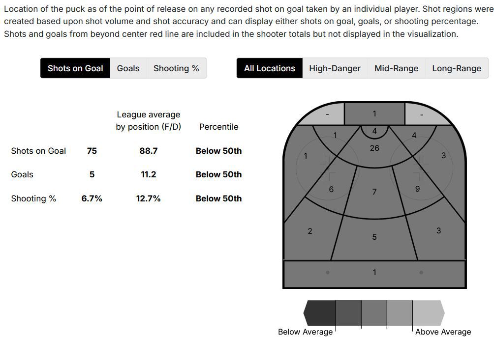 The offense is nonexistent, and as you’ll see in more visual detail below, so, too, is the ability to drive play. Acciari is primarily dishing out hits and playing defense, not much else in any measurable advanced category.