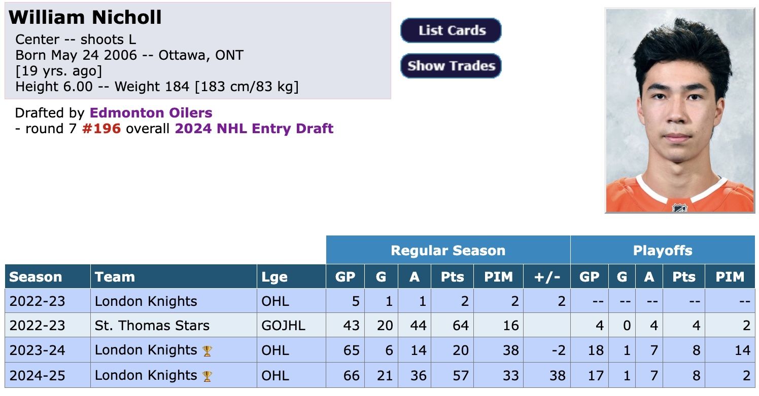 2. Mark Henry at Dobber Hockey had this to say about Nicholl’s game: “An explosive center who creates scoring opportunities using his speed and is not afraid to be physical. Projects as a bottom-six forward. Nicholl took a huge step forward in 2024-2025, helping the London Knights make their way toward a Memorial Cup Championship. Nicholl scored 21 goals and added 36 assists in 66 games. The goals came out of the blue, after scoring just six in 65 games the year before… That he was able to establish himself as a threat on a strong team with minimal powerplay opportunity makes the former seventh-round pick a fun player to root for. Nicholl projects as more of a bottom-six, two-way physical type, but his knack for finding the net will boost his notoriety and rostered percentage in your leagues.”