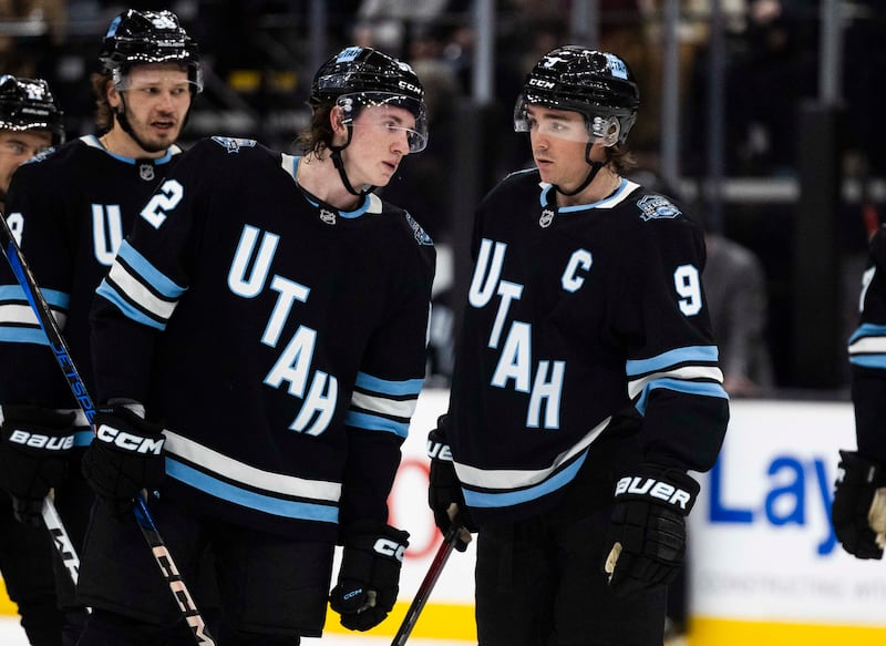 Utah Hockey Club centers Logan Cooley (92) and Clayton Keller (9) both talk with each other during an NHL game between the Utah Hockey Club and the Minnesota Wild at the Delta Center in Salt Lake City on Thursday, Feb. 27, 2025. The Utah Hockey Club claimed victory over the Minnesota Wild, with a final score of 6-1. | Brice Tucker, Deseret News
