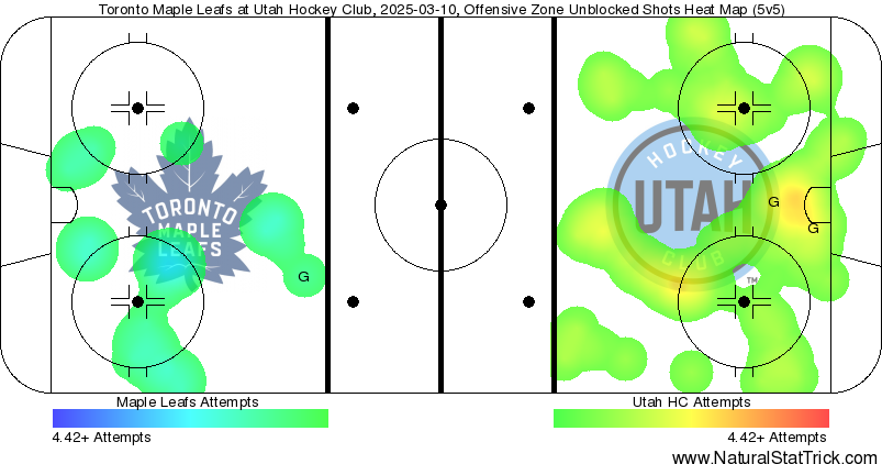 There was a long segment of 4v4 action after the Maple Leafs took a really sloppy too-many-men penalty, followed almost immediately by a high stick on Clayton Keller in the corner. Neither team scored with the extra ice, and the rest of the period was played at five-on-five. Five-on-five play was not kind to the Leafs in this period — attempts were a whopping 22-4 for Utah and shots were 9-2, per Natural Stat Trick.