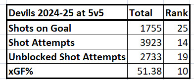 I will say that I don’t think the problem is necessarily system-based. Keefe’s Maple Leafs teams were consistently in the Top 10 in terms of goals per game and xGF% while he was there. And while one could say the Maple Leafs elite players (Matthews, Marner, Nylander) are better than New Jersey’s (Hischier, Hughes, Bratt) when it comes to putting the puck in the net, those Leafs teams also had other issues that ultimately did them in, such as goaltending, defensive play, and star players not showing up at inopportune times. I don’t think these Devils have those issues.