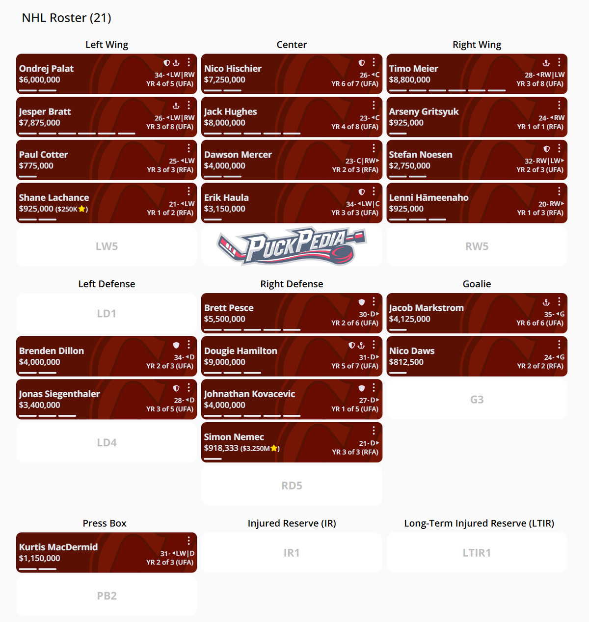 That lineup would cover 21/23 NHL roster spots and leave them $10,219,167 in cap space to fill them. And obviously, Luke Hughes would eat up a big chunk of that. That does not leave enough room for a 3C upgrade, or another middle six scoring option, or heck, a backup goaltender more reliable than a relatively unproven Daws. And counting on three rookie forwards comes with its own set of challenges. I think its unlikely the Devils go that route.