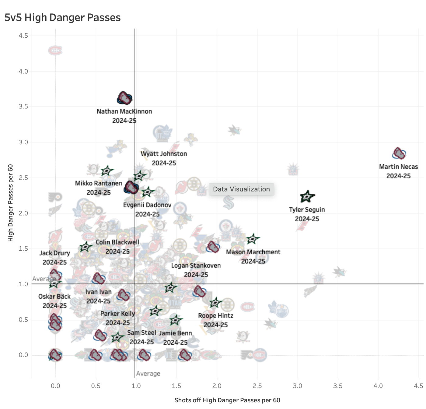 After years of playing with righty Nathan MacKinnon, Johnston’s handedness may help ease Rantanen’s transition. And while Johnston isn’t at MacKinnon’s level, or the same player stylistically, the two have some real potential together. One of the biggest differences is that Johnston isn’t as much of a puck-carrier, but Miro Heiskanen and Thomas Harley can at least add some support from the back end. Johnston’s more of a shooter than a passer, but he generates a lot of high-danger passes, according to Corey Sznajder’s tracking. With a finisher like Rantanen at his side, maybe he becomes even more of a threat.