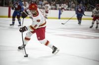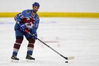 Avalanche alum Kyle Quincey (27) looks for an open teammate during the DU vs Avalanche alumni game at Magness Arena in Denver on Sunday, Aug. 24, 2025. (Stephen Swofford, Denver Gazette)