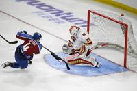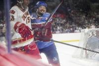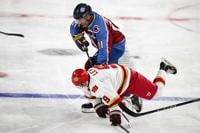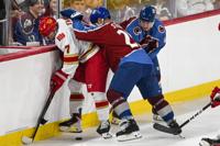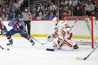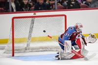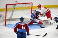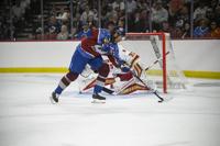 Avalanche alum Max Lacroix (33) misses a block, giving the DU alumni team the win in a shootout during the DU vs Avalanche alumni game at Magness Arena in Denver on Sunday, Aug. 24, 2025. (Stephen Swofford, Denver Gazette)