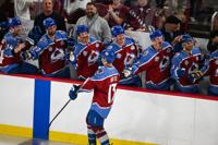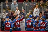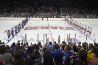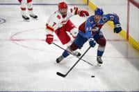 The Avalanche and DU alumni hockey teams line up for the Canadian and US national anthems before the start of the DU vs Avalanche alumni game at Magness Arena in Denver on Sunday, Aug. 24, 2025. (Stephen Swofford, Denver Gazette)