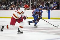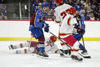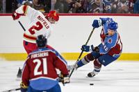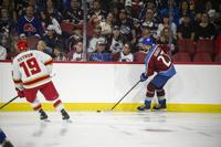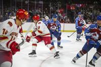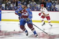 Avalanche alum Peter Forsberg (21) laughs off a near miss during a shootout during the DU vs Avalanche alumni game at Magness Arena in Denver on Sunday, Aug. 24, 2025. (Stephen Swofford, Denver Gazette)