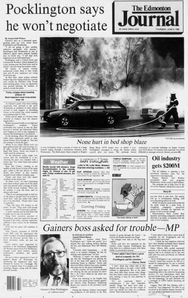 Front page of the Edmonton Journal from June 5, 1986 during the Gainers strike.