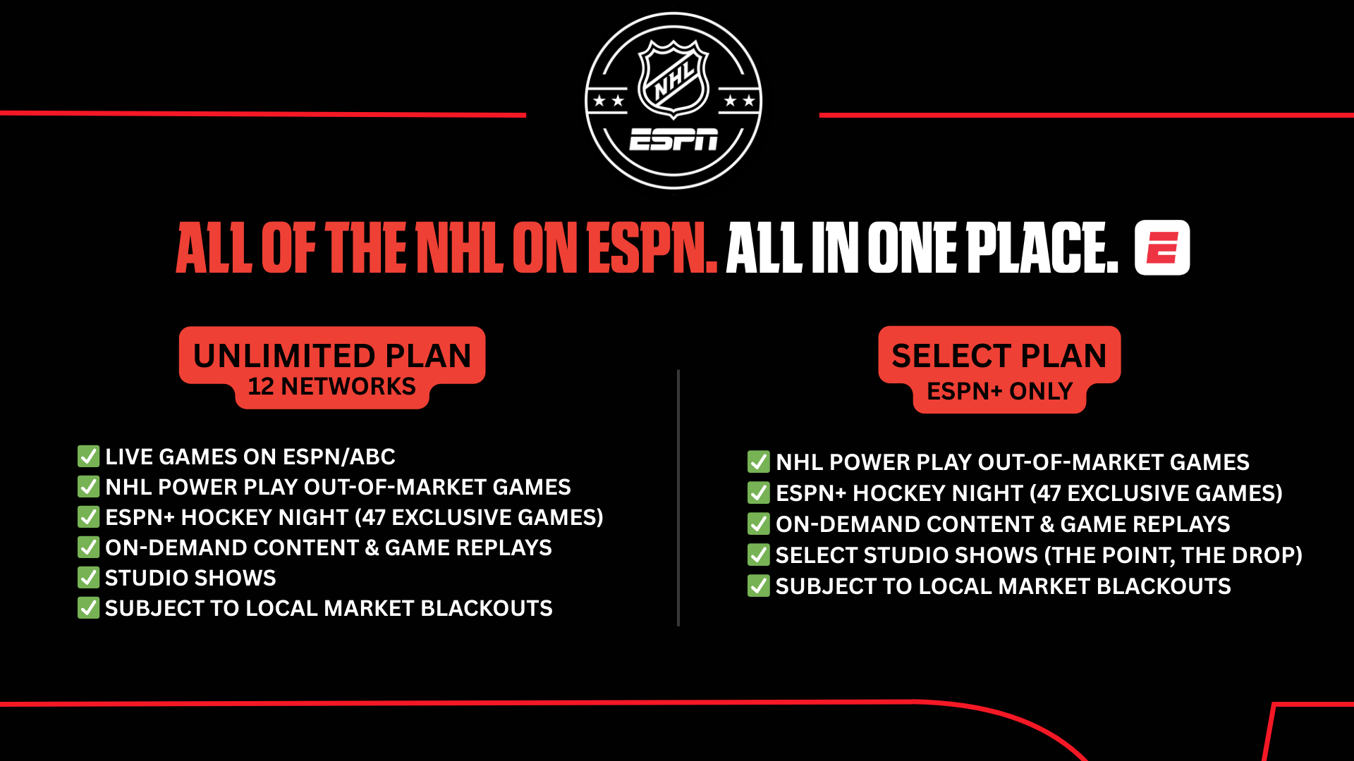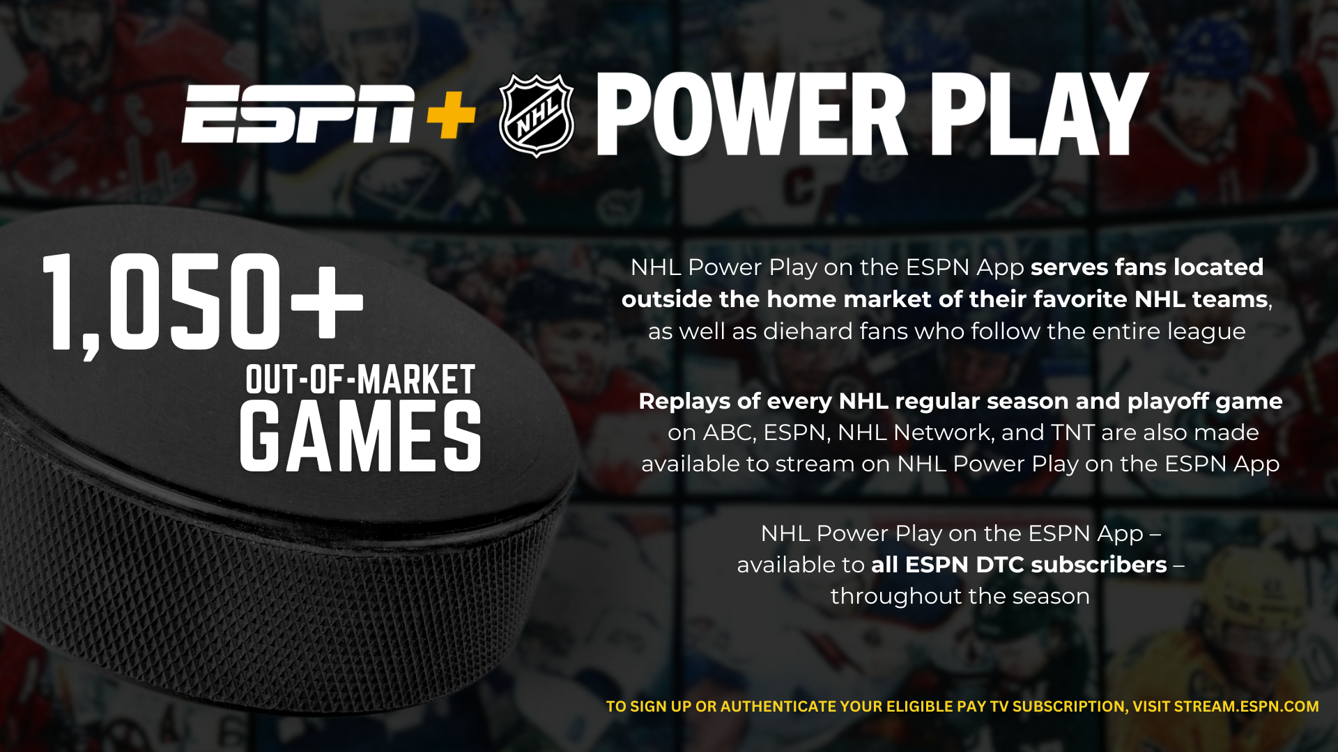 In addition to 47 exclusive games on ESPN+/Hulu, more than 1,050 out-of-market games will be accessible through NHL Power Play on the ESPN App – available to all ESPN DTC subscribers – throughout the season.