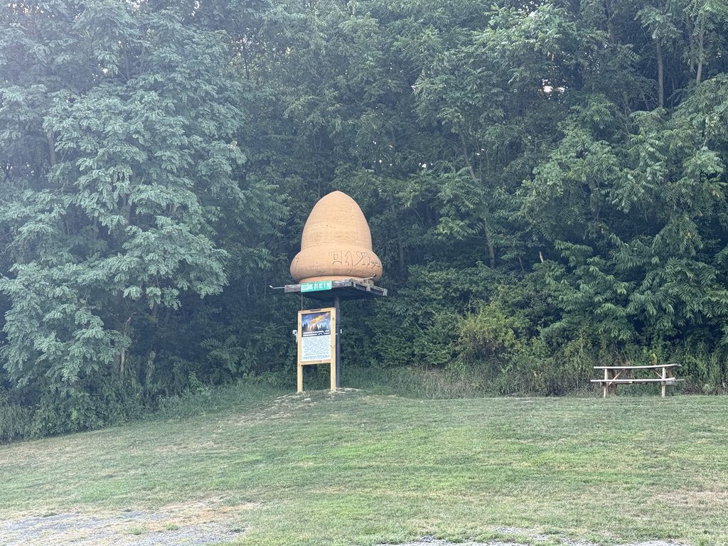 I probably won’t roll past ever again. Fortunately, I spent the afternoon by the water in Ohiopyle, getting close to the end of Catcher in the Rye, which was quite nice. And I couldn’t help myself–you know I love weird little spots and stories–so, on the way home, I stopped in Kecksburg, the site of the second most famous UFO crash. If you don’t know the story, here’s the History Channel “documentary”. Men in black pressured the local radio station to shut up about it, and that’s not a joke. The “monument” was a gift from Unsolved Mysteries.