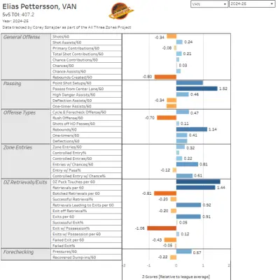Pettersson’s numbers have been on a slow decline over the past three years, particularly his shot production. All Three Zones’ tracking data paints the picture. Despite being above average in shots per 60 in 2022-23 (0.92 z-score), he’s been below average the past two seasons (-0.40 and -0.34, respectively).