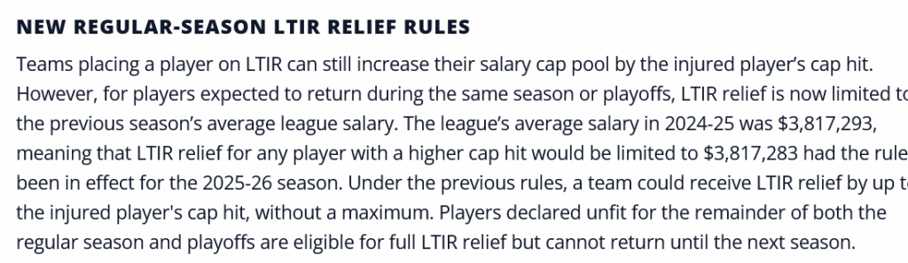 For players who are expected to return to play in the playoffs, long-term injured reserve (LTIR) relief funds are tied to the previous season’s average league salary. The average salary in 2024-25 was $3.82 million.