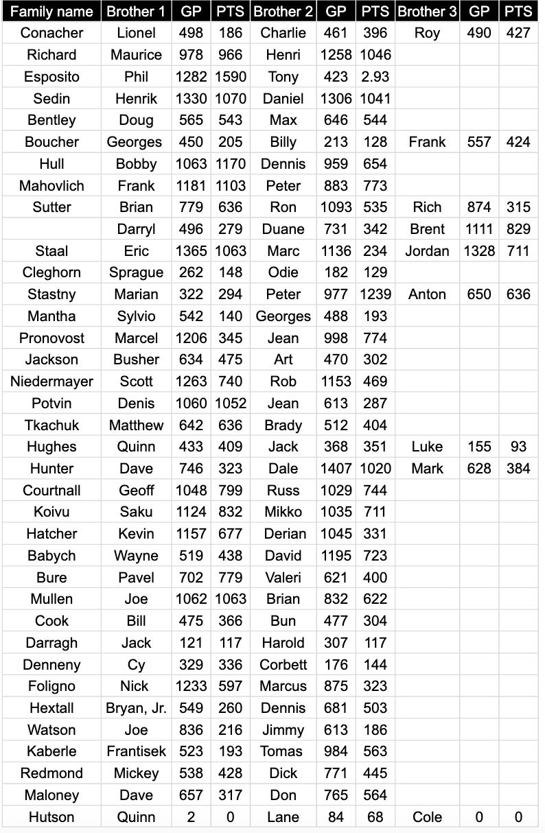 Other top brother acts include Maurice and Henri Richard, Tony and Phil Esposito, Henrik and Daniel Sedin, Max and Doug Bentley, and Georges and Frank Boucher, all of those men in the Hockey Hall of Fame. And then there’s the Sutter brothers, with six brothers making the NHL and having good-to-great careers, Brent Sutter being the best of them.
