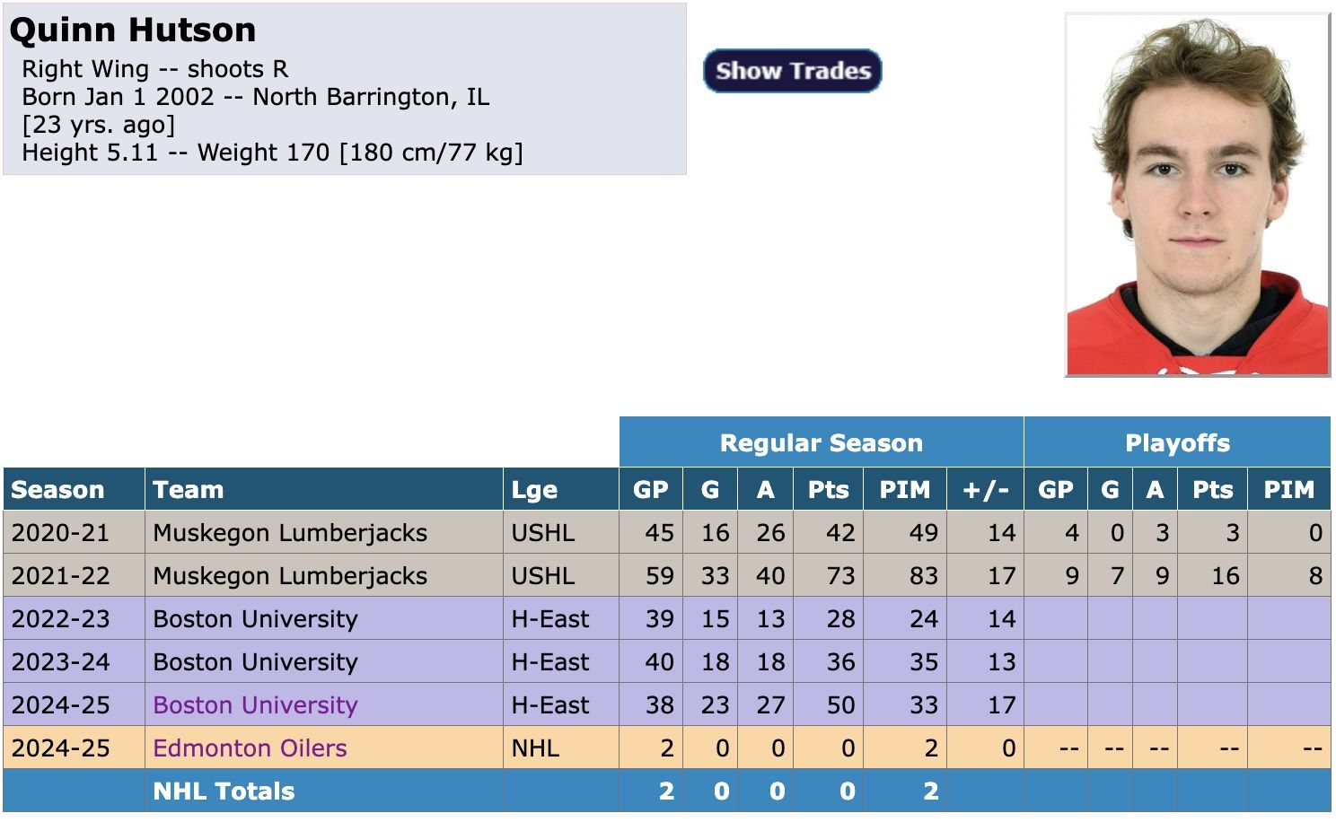 The Oilers have Hutson for one year on an Entry Level Contract. He played two games last spring, but made little impression. It was garbage time for the Oilers, playing out the string in nothing games. At Oilers development camp, Hutson looked smooth and sharp on the ice, excellent with the puck.