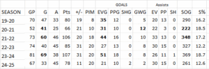 Matthews will be between 47-and-52 goals in 2025-26 we think. He’s hard to slow down for opposition defences. Plus, he will be all around the net generating offence, in order start with some offensive boosts, as he’s known to possess.