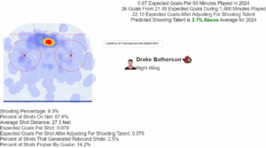 Welcome back to another edition for a point projection for an Ottawa Senators player, and today we will discuss the smooth winger Drake Batherson. Batherson has consistently put up numbers. His size combined with playmaking abilities and hard wrist shot, make him an offensive threat. He’s often found ways to develop chemistry with his linemates. Thus, let’s put it all together, and try to predict how many points Batherson will get 2025-26.