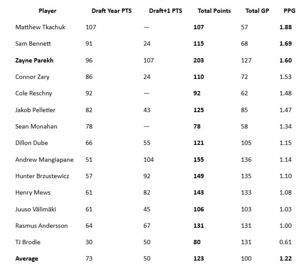 The average Flames CHL graduate posted about 1.22 points per game, with Parekh sitting roughly 30% above that baseline. That’s despite the fact that most of this list is made up of forwards, some of them top-6 contributors (or even stars) at the NHL level.