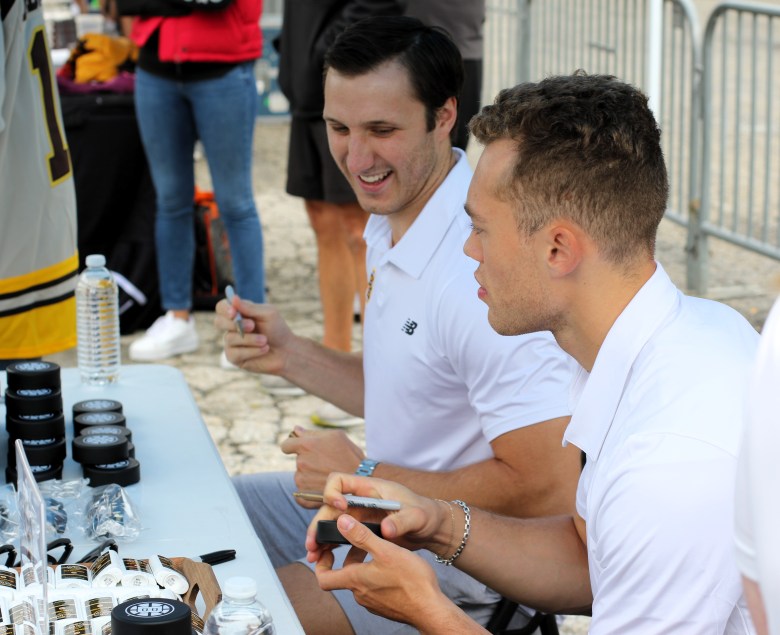 Alex Steeves (L) and Jordan Harris (R) laugh about signing Bruins deodorant. Credit: Alexander Rapp / Monitor