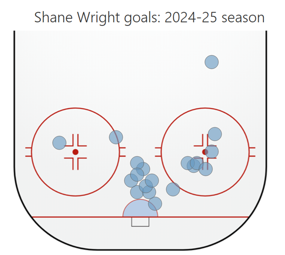 Shane Wright scored his 19th goal of the season Saturday night. I think it’s safe to say he has exceeded expectations. Before the season, I often pointed out his ability to get shots off from inside — the high-danger area. Take a look at his goal location chart.
