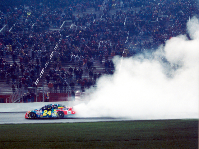 On race day, Gordon battled a ton of traffic early on and had a very loose car to contend with. Halfway through the race, it looked as if his title chances had dimmed. However, through grit, determination and the team’s championship mettle, Gordon leaned on crew chief Ray Evernham and the “Rainbow Warriors” to make the right adjustments. It eventually worked, as the brightly hued No. 24 worked its way up to 17th, just enough to clinch the championship.