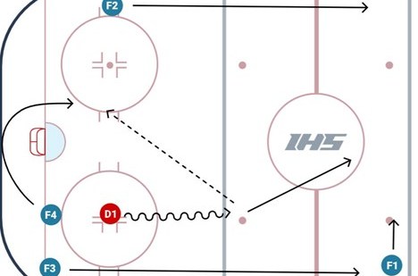The D carrying up will meet the pressure from the first PKer, as the rest of the opposition starts to back off. The drop pass forces them to re-gap, causing a speed differential. Jack then has a read-option with Bratt driving up the middle and Nico/Noesen out wide for further distribution. The point is to take advantage of having an extra guy out there and creating a mini- 2 on 1 on to enter the zone.