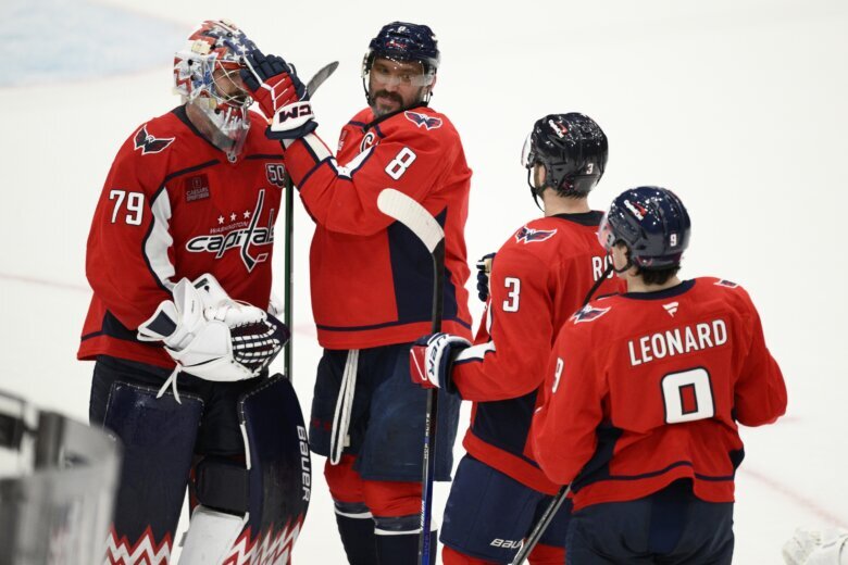 Washington Capitals left wing Alex Ovechkin (8) celebrates with goaltender Charlie Lindgren (79), defenseman Matt Roy (3) and right wing Ryan Leonard (9) after an NHL hockey game against the Carolina Hurricanes, Thursday, April 10, 2025, in Washington. (AP Photo/Nick Wass)(AP/Nick Wass)