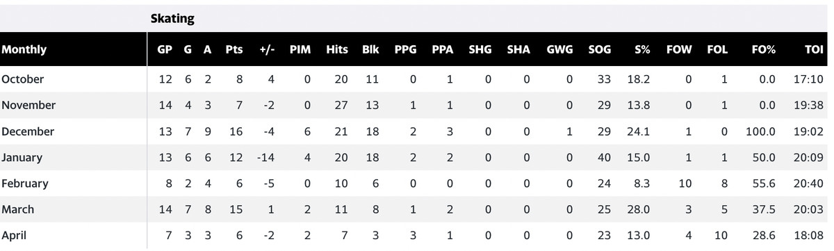 This was a remarkably consistent season for Rakell. Other than a down month in November, he was close to a point-per-game in almost every month, especially once the calendar rolled over to December.