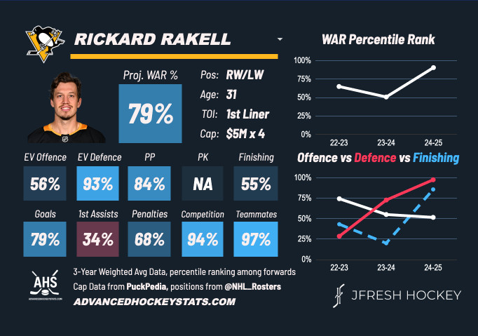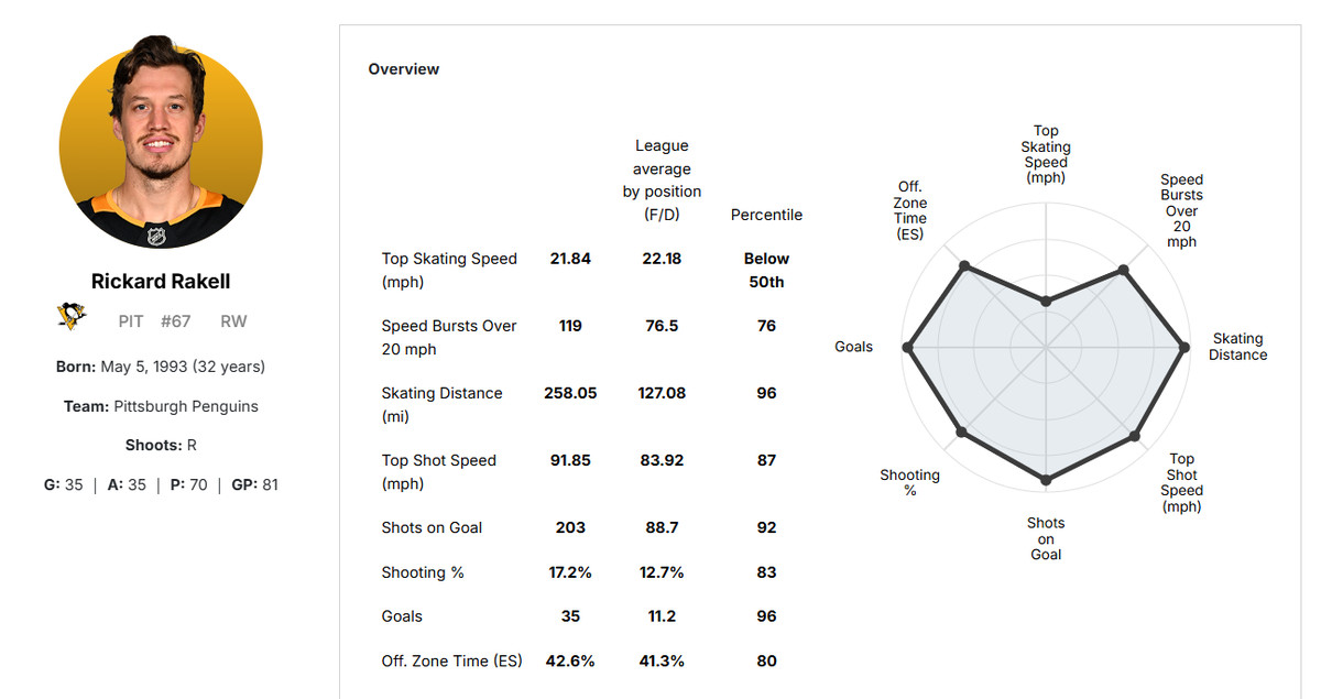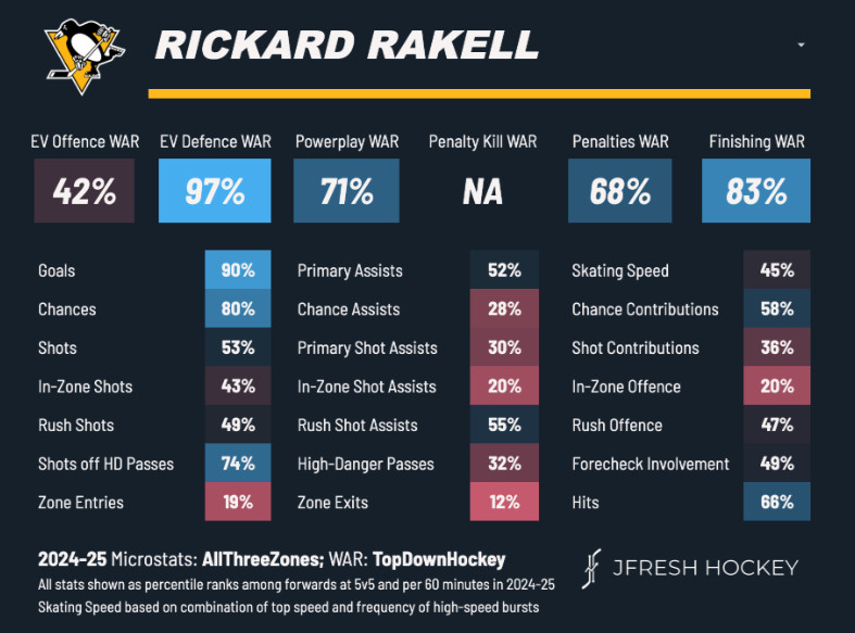 Not only were Rakell’s traditional box score numbers among the best on the Penguins this season, his advanced numbers and analytics were also among the best across the board.