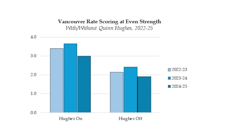 For baselining purposes, Vancouver’s rate scoring over the past three seasons with Hughes deployed is comparable to that of is comparable to that of Dallas’ with Mikko Rantanen on the ice, or Toronto previously with Mitch Marner on the ice. The problem is that when Hughes comes off the ice, Vancouver is barely scoring 2.0 goals per 60 minutes. That’s less than what the Nashville Predators averaged a season ago, and they finished as the league’s weakest offence.