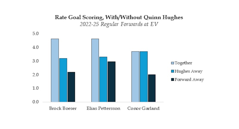 Hughes is a dynamic playmaker who can ignite offence from the back end on any shift, and what he brings to the ice benefits every forward in the Vancouver lineup. But again, therein lies the problem – when players like Pettersson, Boeser, and Garland play with Hughes, they are an absolute force. When they don’t play with the Hughes pairing, their scoring suffers dramatically: